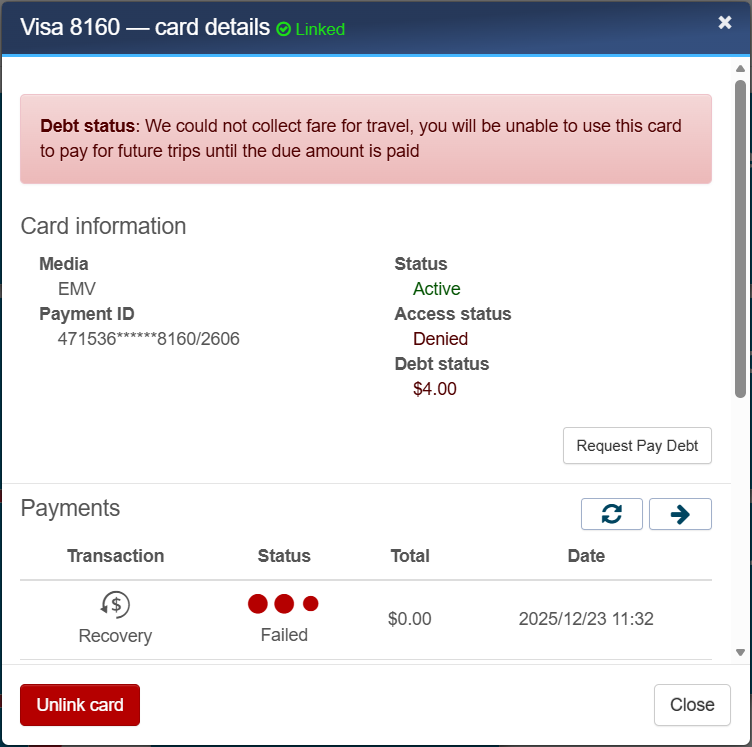 - Review payment or trip details: routes taken, fare paid for each route and date/time.