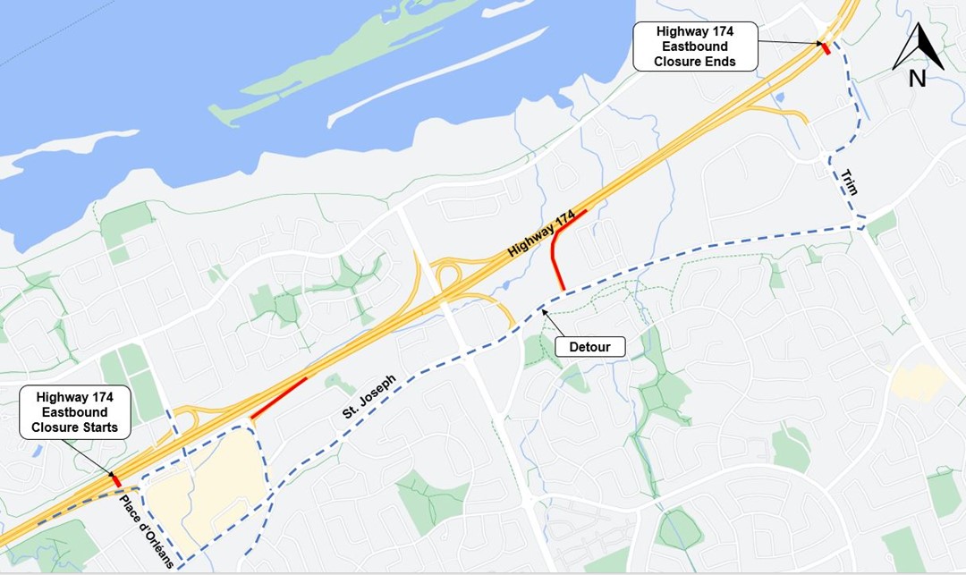 A full closure of eastbound Highway 174 between Place d’Orléans Drive and Trim Road. The Place d’Orléans Drive on-ramp and the St. Joseph Boulevard on-ramp to eastbound Highway 174 will also be closed.