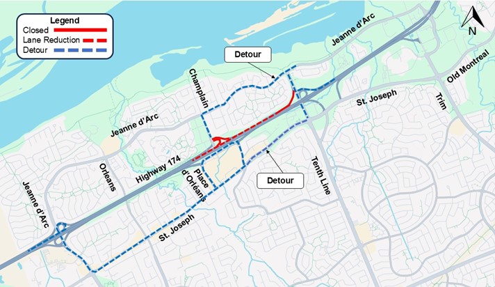 Motorists travelling westbound on Highway 174 looking to access Champlain Street and Place d’Orléans Drive areas will exit at Tenth Line Road and use Jeanne d’Arc Boulevard to the north or St. Joseph Boulevard to the south.