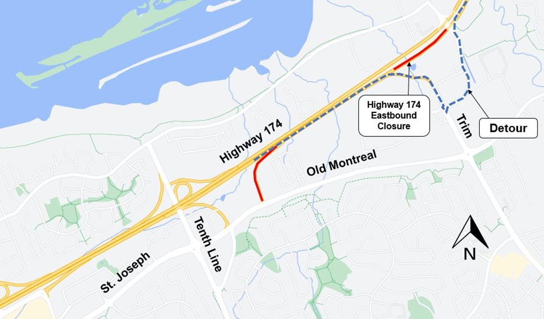 Full closure of Highway 174 eastbound from Tenth Line Road to Trim Road. The Highway 174 eastbound on-ramp from St. Joseph Boulevard will also be closed.