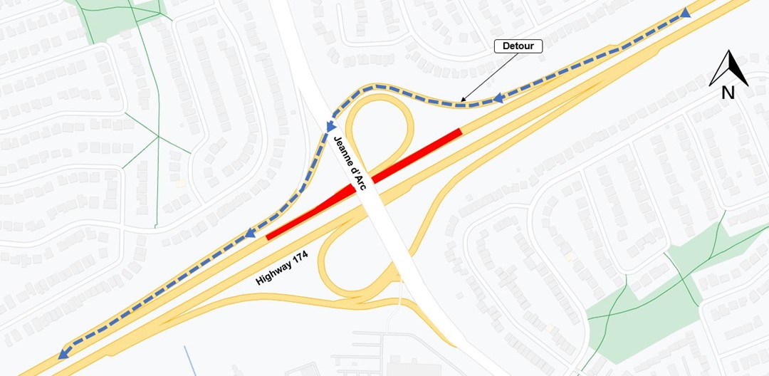 Motorists travelling westbound on Highway 174 will exit at Jeanne d’Arc Boulevard, continue through the intersection at the end of the exit ramp and then re-enter Highway 174 using the westbound Jeanne d’Arc Boulevard on-ramp.
