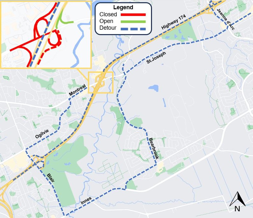 - Take Montreal Road to Ogilvie Road and travel south to Blair Road. Turn left and travel south on Blair Road to Innes Road. Turn left onto Innes Road and travel east to Bearbrook Road. Turn left onto Bearbrook Road, and travel north to connect to St. Joseph Boulevard. Turn right on to St. Joseph Boulevard and travel east to Jeanne d’Arc Boulevard. Take the third exit at the roundabout to travel north to connect to Highway 174 eastbound at the Jeanne d’Arc interchange.