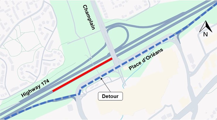 Motorists will perform a simple ramp surf at Place d’Orléans. They will exit the Highway using the eastbound off-ramp, drive east on Place d’Orléans Drive, and rejoin eastbound Highway 174 using the eastbound on-ramp.