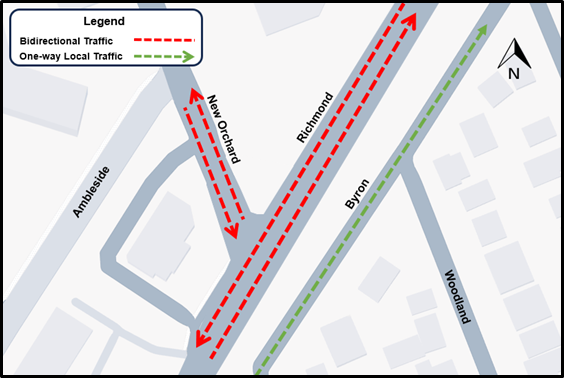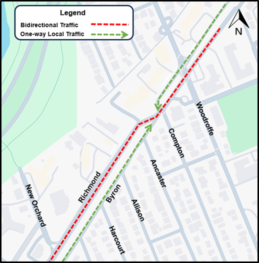 The intersections Woodroffe Avenue at Richmond Road and New Orchard Avenue North at Richmond Road will be reopening to traffic. Northbound and southbound traffic will be able to move through the Woodroffe Avenue at Richmond Road intersection. Access at Lockhart Avenue North will be closed to vehicular traffic. Traffic from Ambleside Drive and New Orchard Avenue North will be able to access Richmond Road via New Orchard Avenue North.