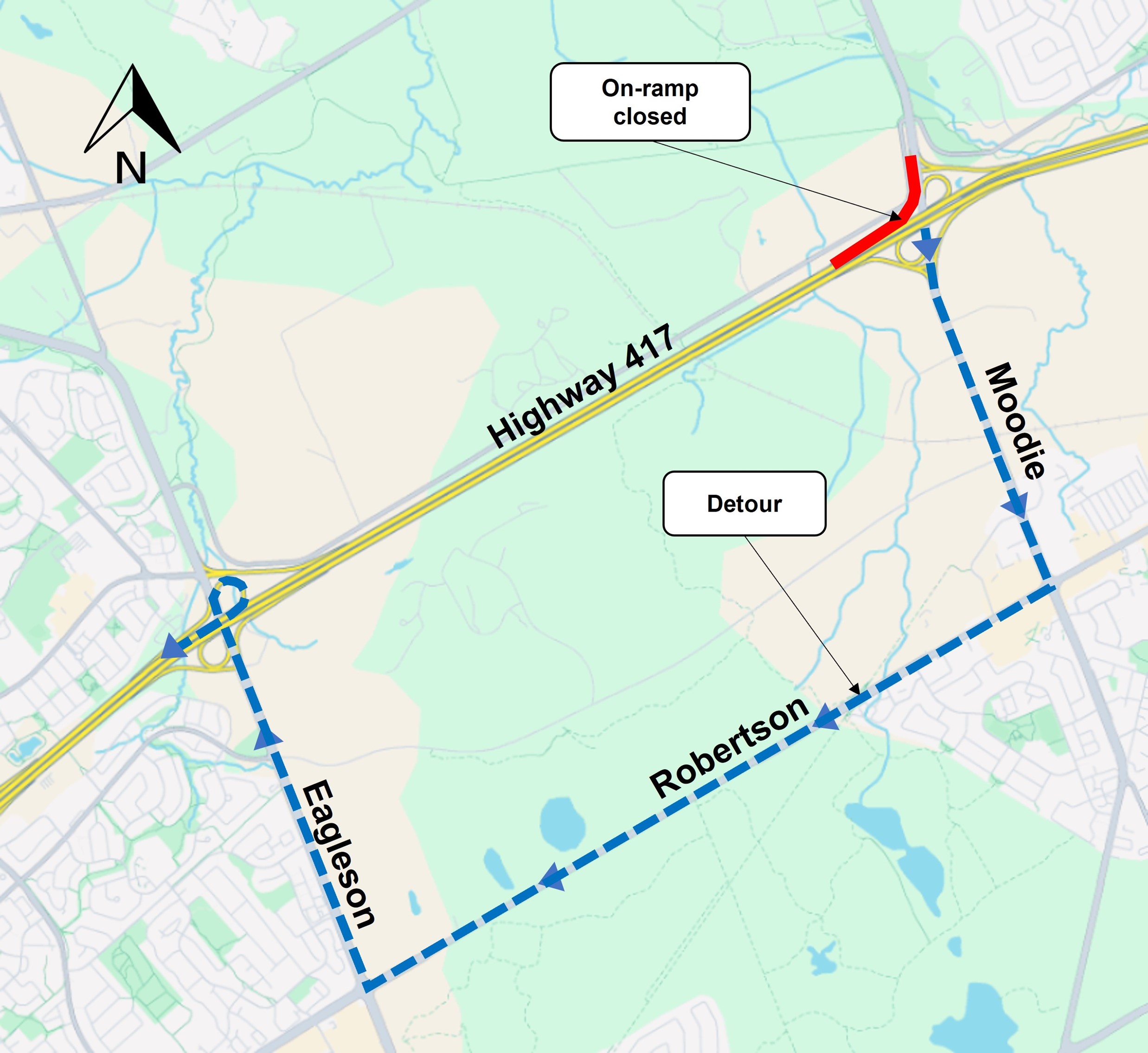Motorists wishing to access westbound Highway 417 from southbound Moodie Drive will continue south on Moodie Drive until reaching Robertson Road. They will then turn right onto Robertson Road and proceed west until reaching Eagleson Road. They will turn right onto Eagleson Road and continue north until reaching the westbound Highway 417 on-ramp.