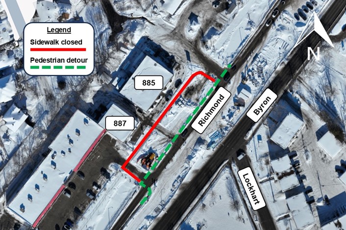 Long-term closure of the north sidewalk on Richmond Road at Lockhart Avenue. A detour will be in place.