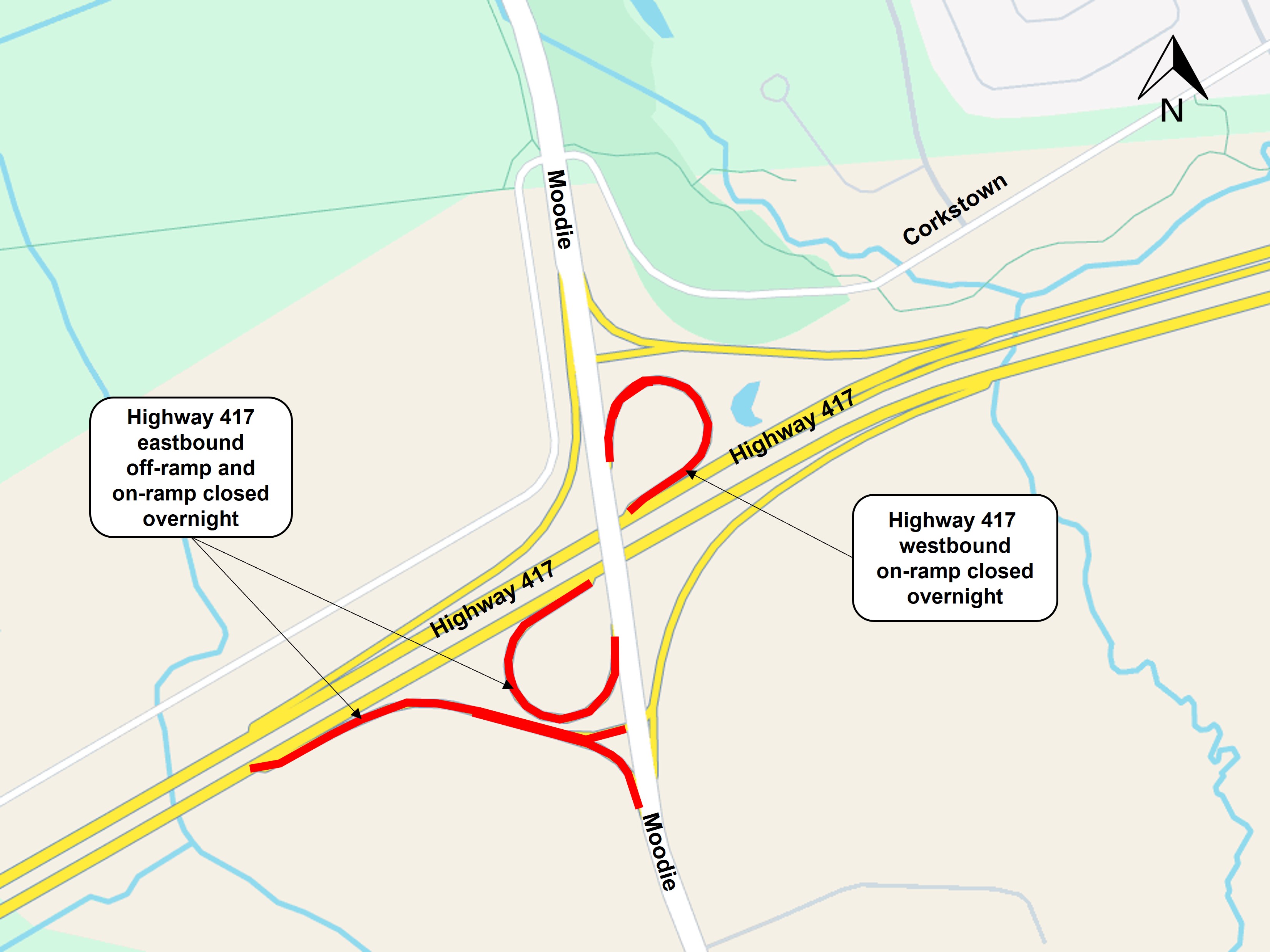 The Highway 417 westbound on-ramp from northbound Moodie Drive will be closed on Tuesday, July 8 and Wednesday, July 9 from 11 p.m. until 5 a.m.