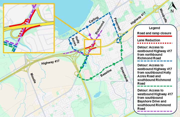 Closure of northbound Richmond Road at the Highway 417 interchange, lane reduction on southbound Richmond Road at the Highway 417 interchange, closure of the on-ramp from northbound Richmond Road to eastbound Highway 417, and ongoing closure of the on-ramp from southbound Richmond Road to westbound Highway 417.