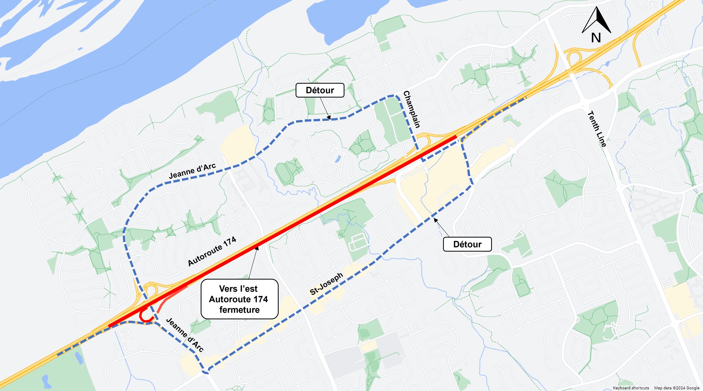Les automobilistes circulant sur la route régionale 174 en direction est emprunteront la sortie vers le boulevard Jeanne-d’Arc vers le boulevard St-Joseph, emprunteront le carrefour giratoire pour se diriger en direction est sur le boulevard St-Joseph puis reprendront la route régionale 174 en utilisant la bretelle d’accès à la promenade Place d’Orléans en direction est.