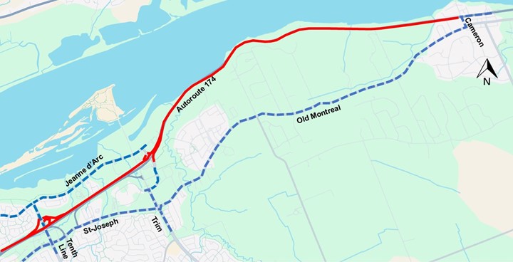Les automobilistes circulant en direction ouest et en direction est sur l’autoroute 174, de même que les automobilistes au nord et au sud de l’autoroute 174 à la hauteur de la rue Champlain, du chemin Tenth Line et du chemin Trim emprunteront le boulevard Jeanne-d'Arc au nord de l’autoroute et le boulevard St-Joseph/chemin Old Montreal au sud de l’autoroute pour se diriger vers l’est et l’ouest.