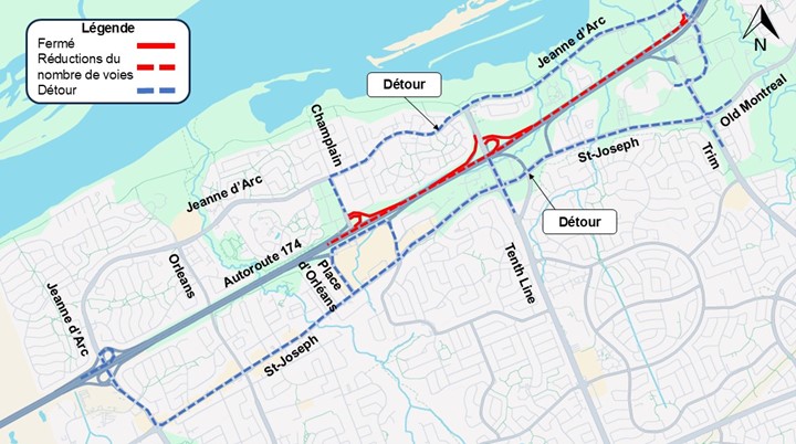La route régionale 174 en direction ouest sera fermée entre le chemin Trim et la rue Champlain pendant que les équipes travaillent sur la route régionale. Les bretelles suivantes seront également fermées :