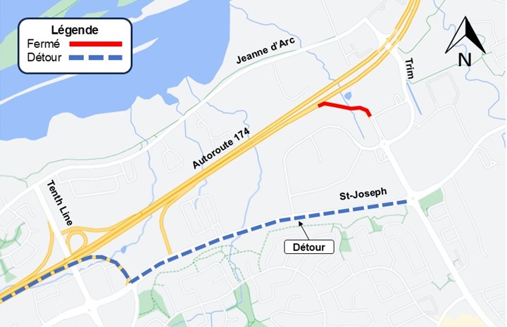 Les automobilistes circulant en direction est sur l’autoroute 174 souhaitant accéder au chemin Trim au sud de l’autoroute 174 emprunteront la sortie vers le chemin Tenth Line et tourneront à gauche pour circuler en direction est sur le boulevard St-Joseph jusqu’au chemin Trim.