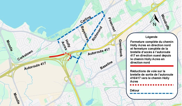 Les automobilistes au sud de l’autoroute 417 souhaitant circuler en direction nord sur le chemin Holly Acres emprunteront le chemin Richmond pour se diriger vers le chemin Pinecrest. Ils circuleront en direction nord sur le chemin Pinecrest vers l’avenue Carling et continueront en direction ouest sur l’avenue Carling jusqu’au chemin Holly Acres.