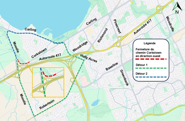 Les automobilistes peuvent également circuler vers l’est sur le chemin Corkstown vers l’avenue Carling, où ils tourneront à gauche pour circuler en direction ouest sur l’avenue Carling. Ils tourneront ensuite à gauche pour circuler vers le sud sur la promenade Moodie.