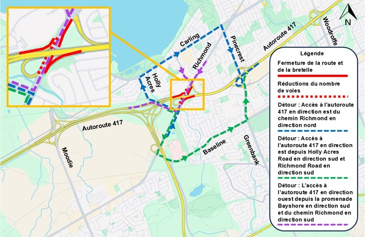 Les automobilistes souhaitant accéder à l’autoroute 417 en direction ouest depuis la promenade Bayshore en direction sud et le chemin Richmond en direction sud se dirigeront en direction sud sur le chemin Richmond vers le chemin Holly Acres. Ils tourneront ensuite à droite sur le chemin Holly Acres et continueront en direction nord-ouest pour utiliser la bretelle d’accès à l’autoroute 417 en direction ouest.