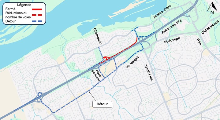 Les automobilistes au sud de la route régionale 174 à la hauteur de la rue Champlain et de la promenade Place d’Orléans souhaitant circuler en direction ouest sur la route régionale 174 utiliseront la bretelle d’accès depuis le boulevard Jeanne-d’Arc.