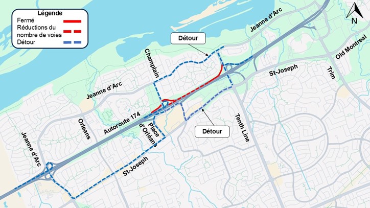 Les automobilistes circulant en direction ouest sur la route régionale 174 souhaitant accéder à la rue Champlain et à la promenade Place d’Orléans emprunteront la sortie vers le chemin Tenth Line et utiliseront le boulevard Jeanne-d’Arc vers le nord ou le boulevard St-Joseph vers le sud.