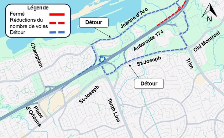Les automobilistes au nord de la route régionale 174 à la hauteur du chemin Trim souhaitant circuler en direction ouest sur la route régionale 174 se dirigeront en direction ouest sur le boulevard Jeanne-d’Arc jusqu’au chemin Tenth Line et reprendront la route régionale 174 en direction ouest à la hauteur de l’échangeur du chemin Tenth Line.