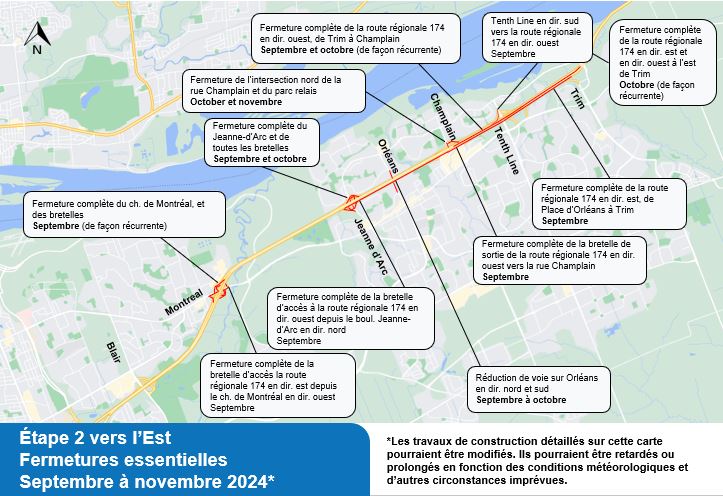 Cette carte montre les fermetures critiques actuellement prévues sur l'autoroute 174 de septembre à novembre 2024.
