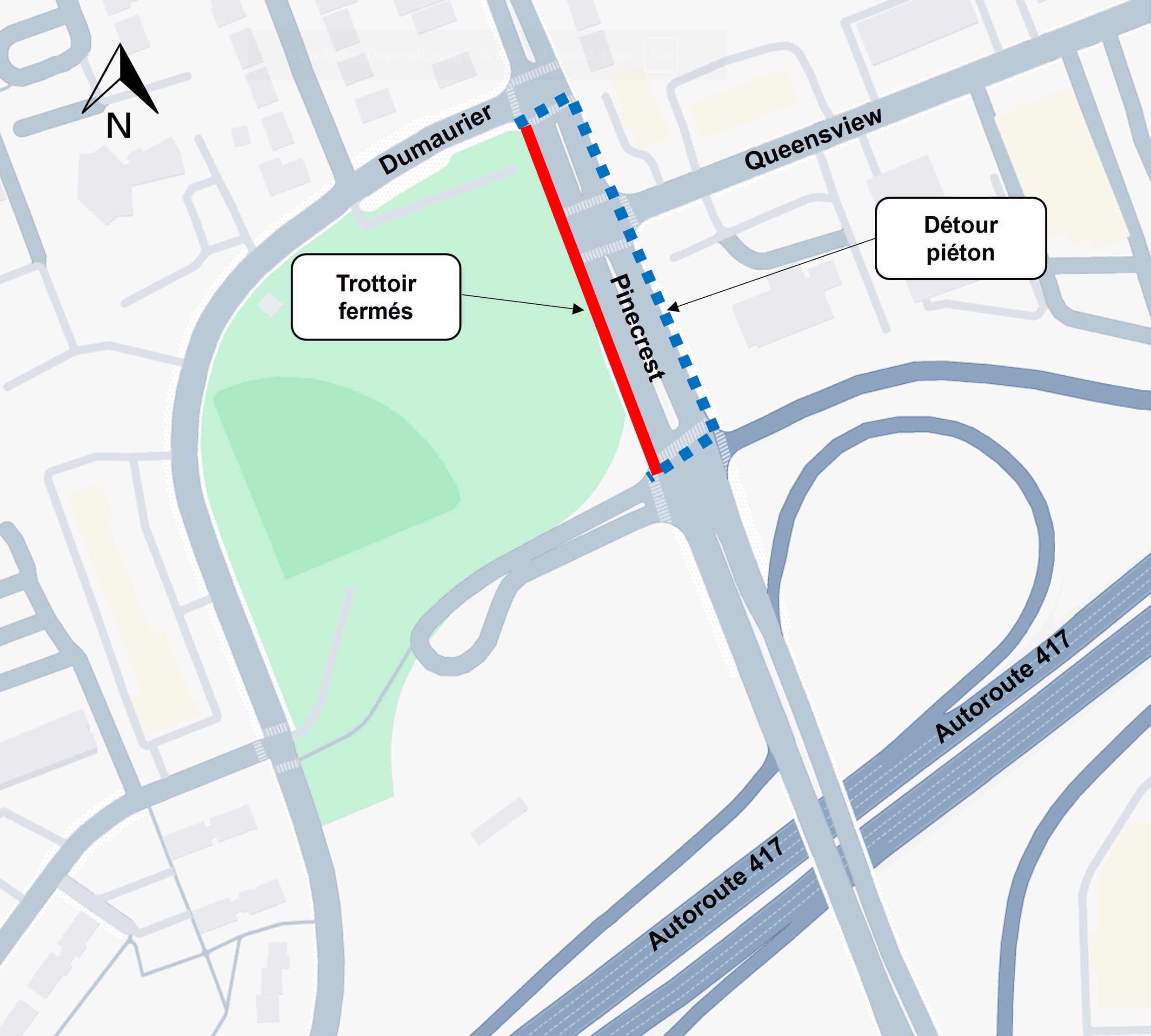 Les piétons utilisant le trottoir ouest sur le chemin Pinecrest devront suivre les panneaux de détour et traverser du côté est de la rue, soit à l’angle de l’avenue Dumaurier ou à l’intersection du Transitway, tout juste au nord de l’autoroute 417.