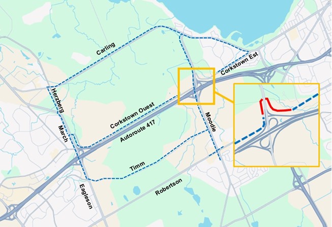 Les automobilistes au sud de l’autoroute 417 sur la promenade Moodie souhaitant accéder au chemin Corkstown Est circuleront en direction nord sur la promenade Moodie vers l’avenue Carling. Ils tourneront à droite et circuleront en direction est sur l’avenue Carling vers l’intersection avec le chemin Corkstown. Les automobilistes tourneront à droite sur le chemin Corkstown et se dirigeront en direction ouest jusqu’à leur destination.