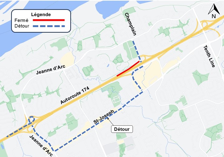Fermeture complète de la bretelle d’accès à la route régionale 174 en direction ouest depuis la rue Champlain en direction sud.