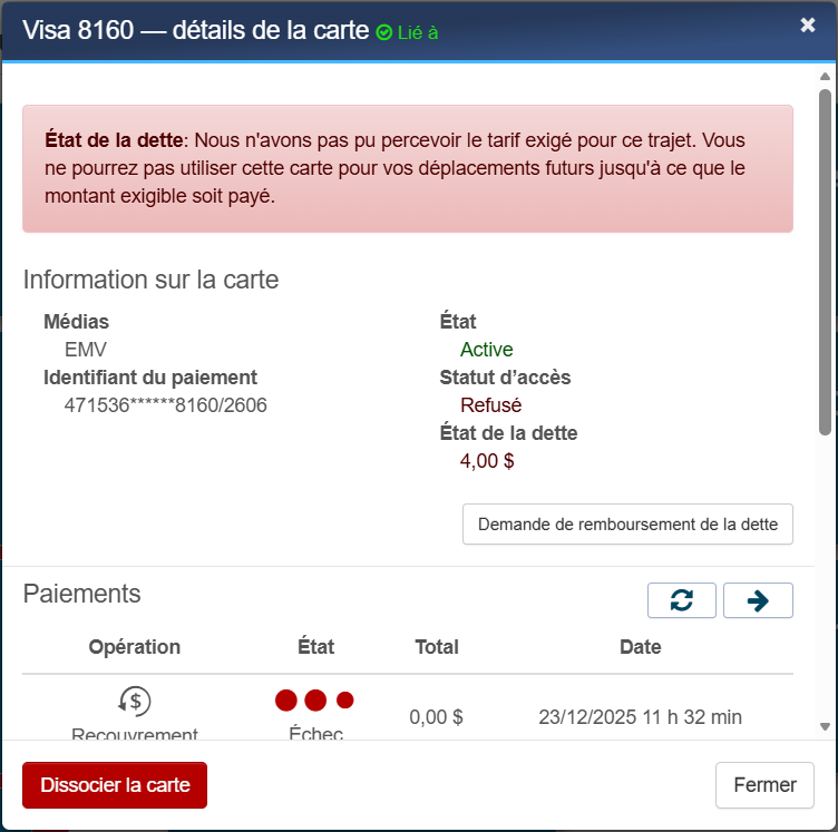 Si votre carte est refusée sur le lecteur, cela pourrait entraîner un solde impayé. O-Paiement tentera de débiter le tarif, mais si la transaction est à nouveau refusée après 5 à 10 secondes, vous pouvez :