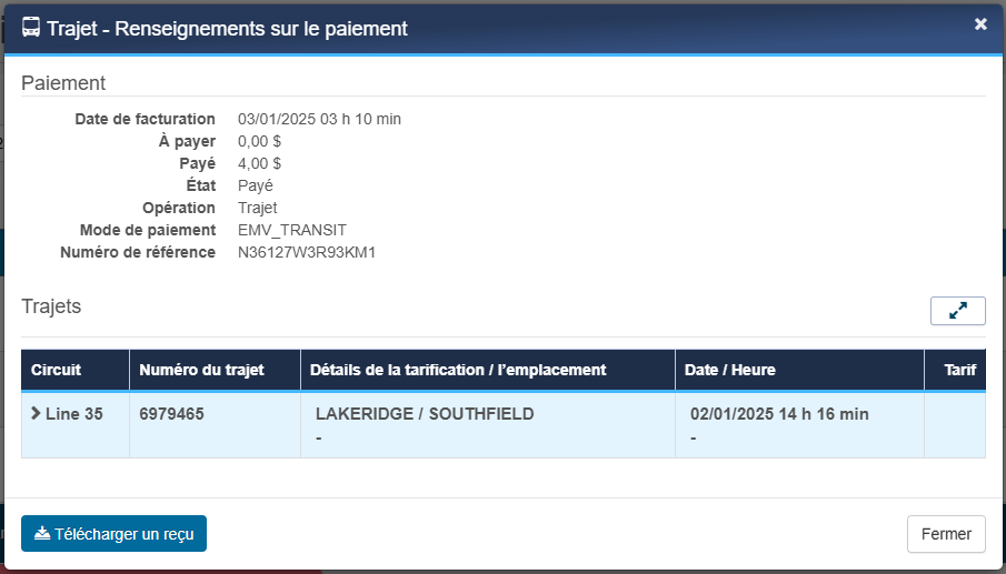 - Revoir d’autres détails en cliquant avec le curseur sur « paiement » ou « trajet » à droite.