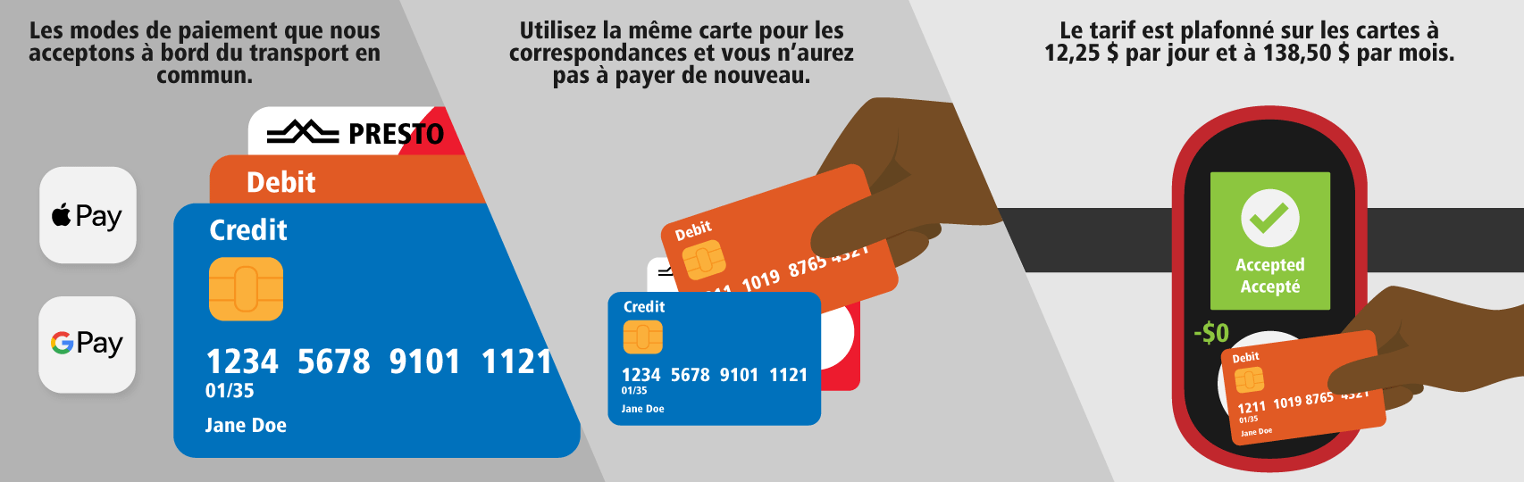 Lorsque vous effectuez une correspondance entre des trajets à bord d’autobus et de l’O-Train, utilisez la même carte pour payer chaque fois. Le passage ne vous sera pas facturé une deuxième fois si vous êtes à l’intérieur de la fenêtre de correspondance. Avec les paiements par carte de débit et de crédit, le tarif quotidien est plafonné au prix d’un Passejour (12,25 $) et les déplacements mensuels seront automatiquement plafonnés au tarif d’un laissez-passer mensuel pour adultes (138,50 $).
