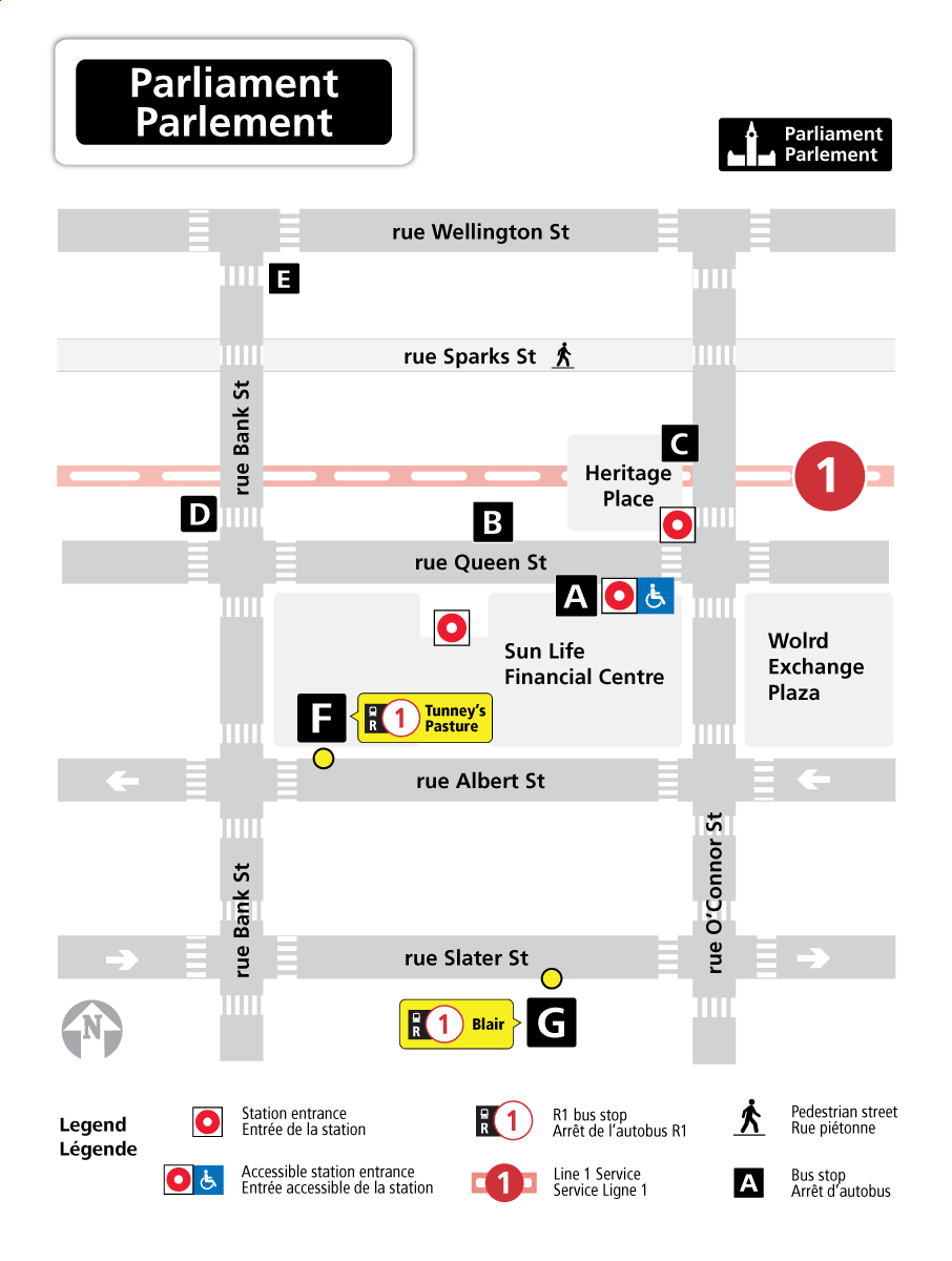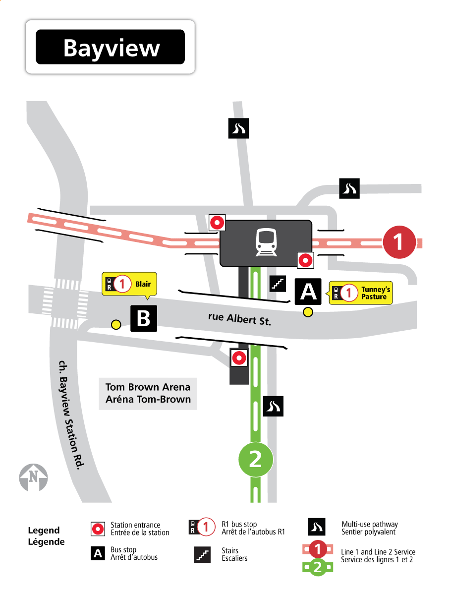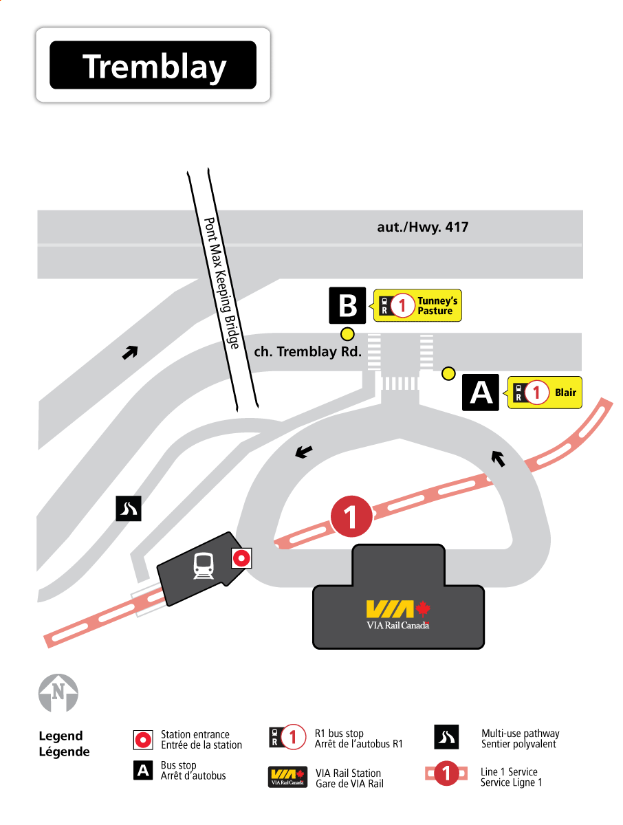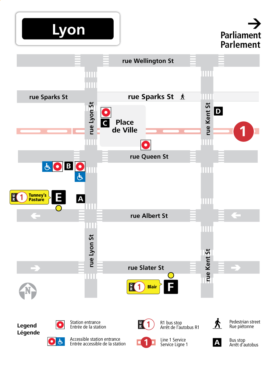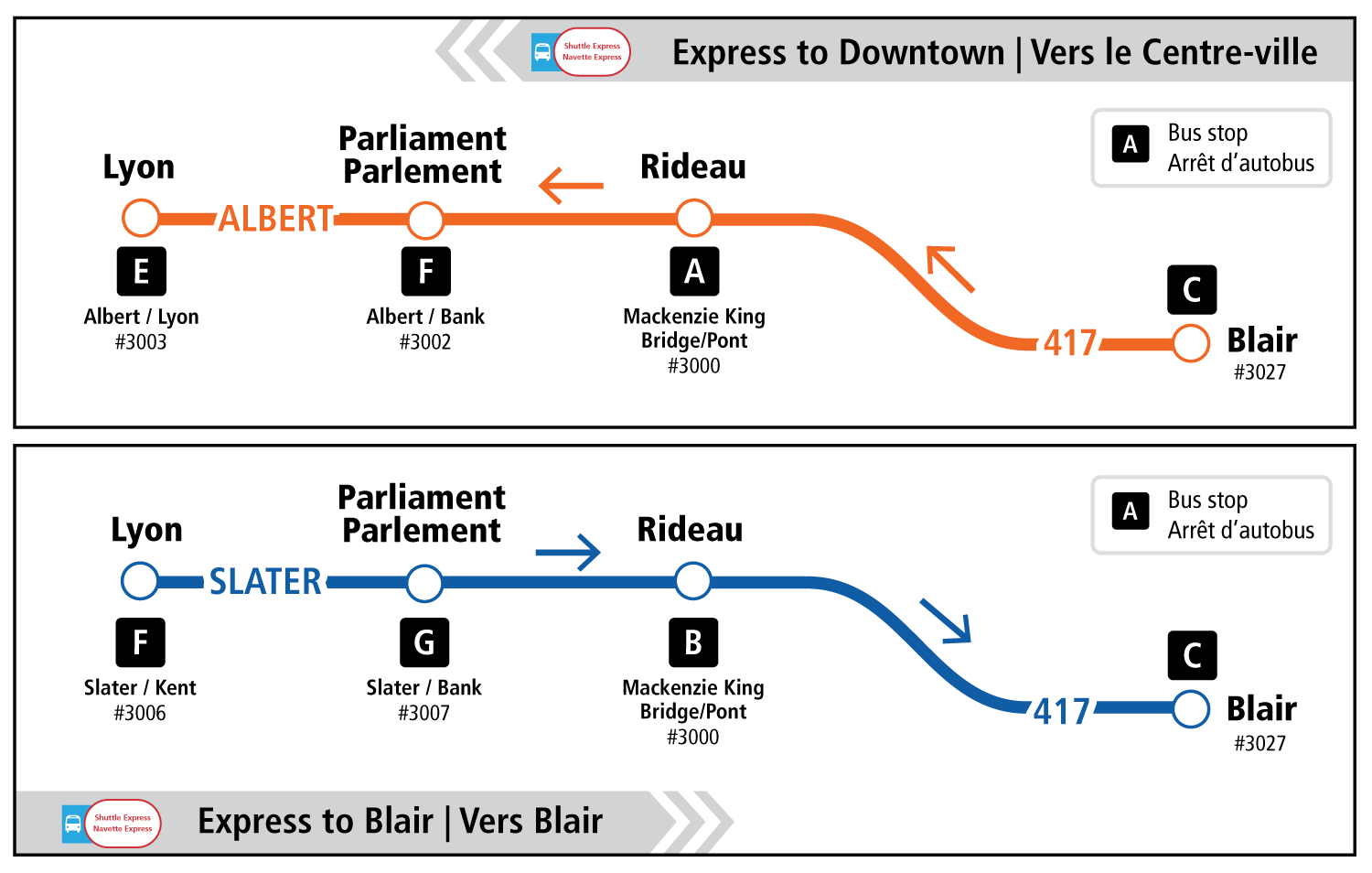 Blair to Lyon: From Blair Station, turn right to Gloucester Centre roadway, right to Blair, right to Highway 417, exit at Nicholas, left onto Mackenzie King Bridge, continue to Albert then Lyon station.