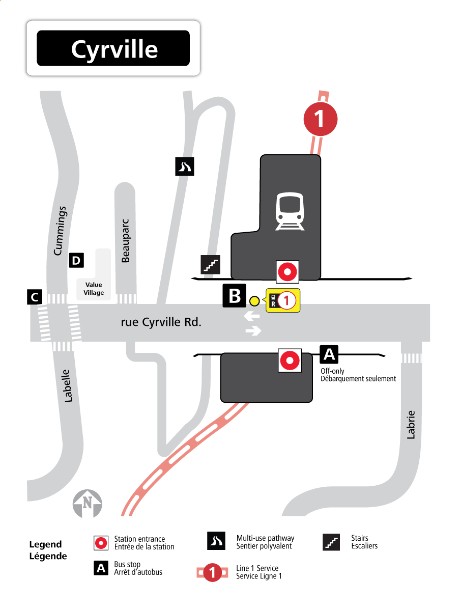 St-Laurent to Cyrville: From St-Laurent Station, continue down ramp towards St-Laurent Boulevard, turn right onto St-Laurent, right onto Ogilvie, right onto Cyrville to Cyrville Station.