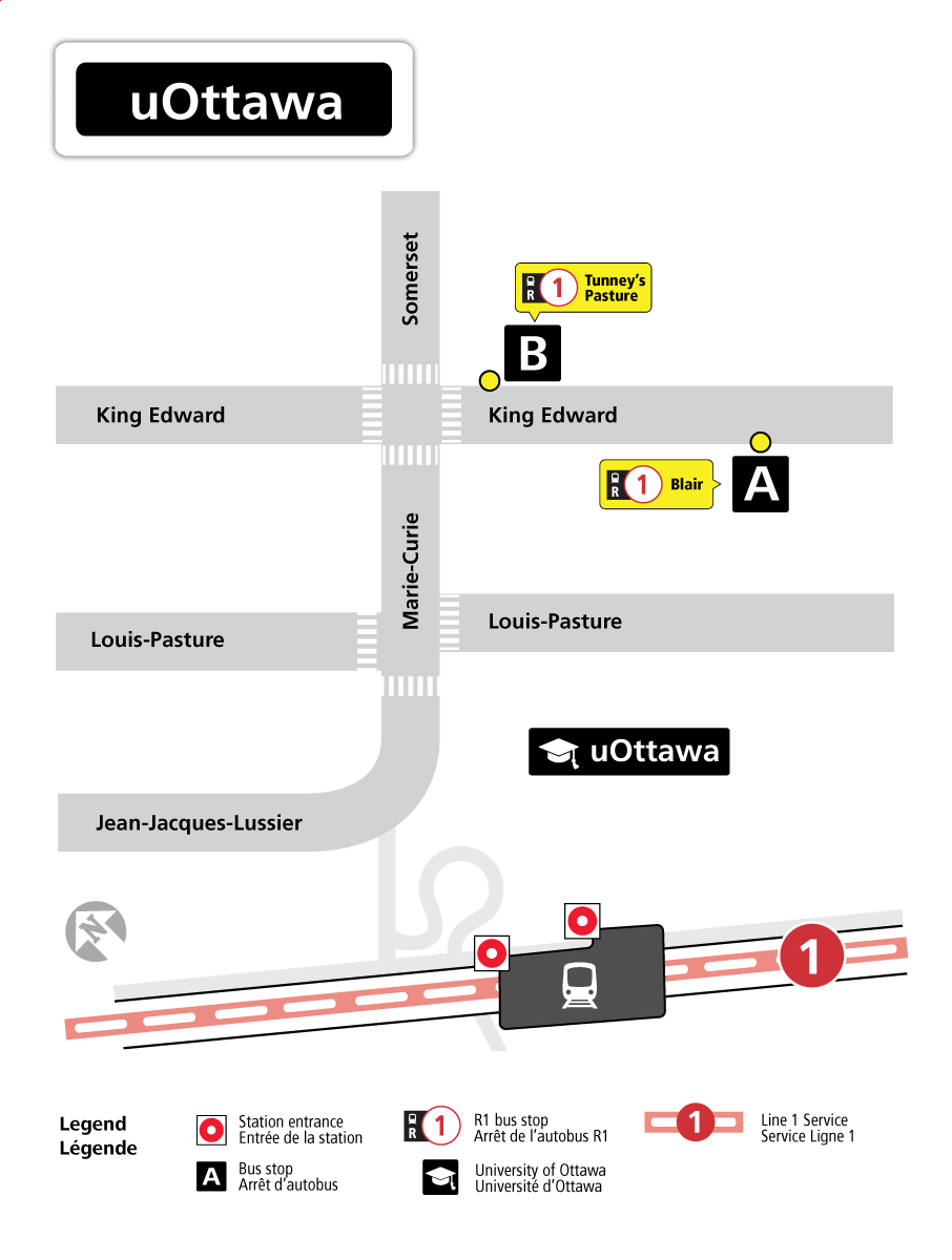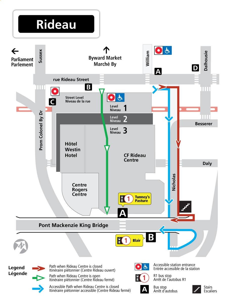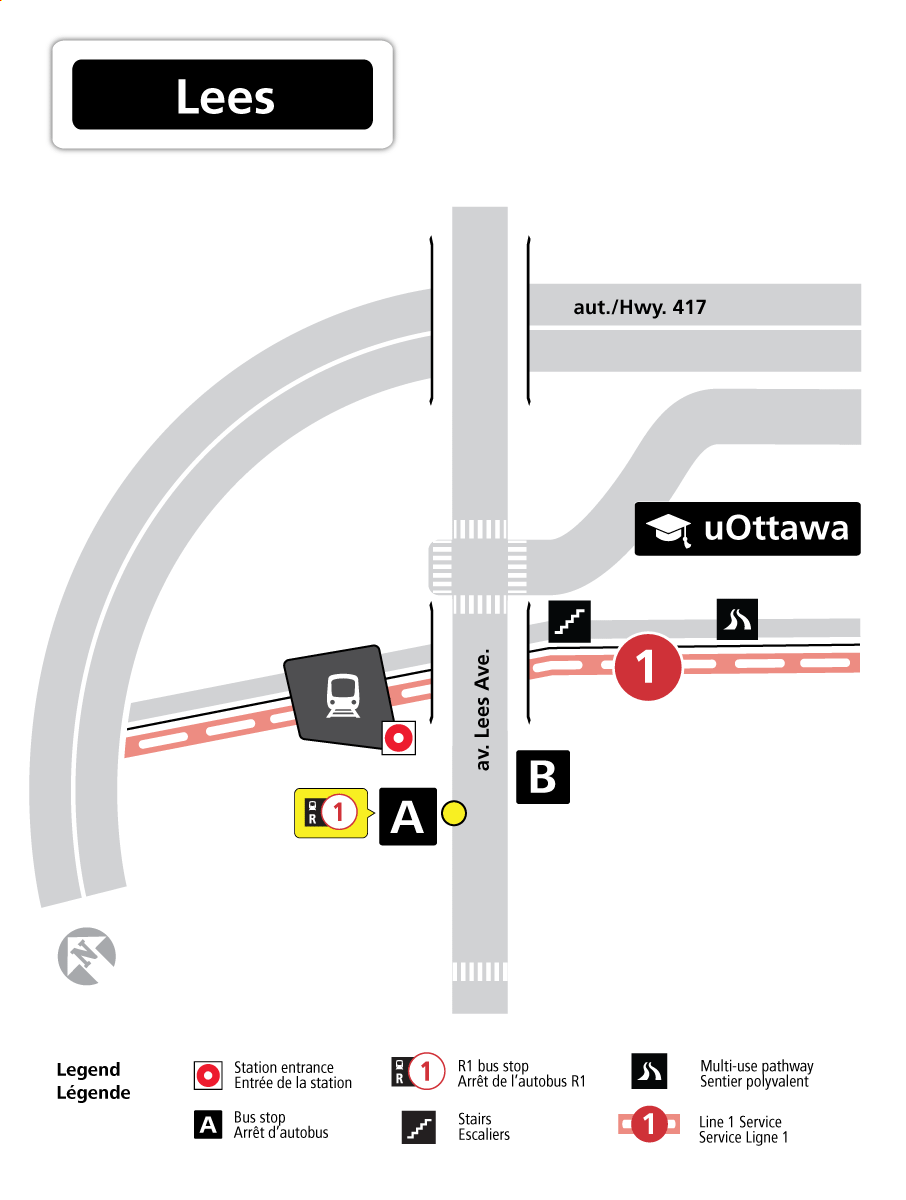 Rideau (Mackenzie King Bridge) to Lees : From Mackenzie King Bridge service stop, turn right onto Nicholas, keep left in Nicholas, left onto Laurier, right onto King Edward, continue onto Mann, to Lees Station.